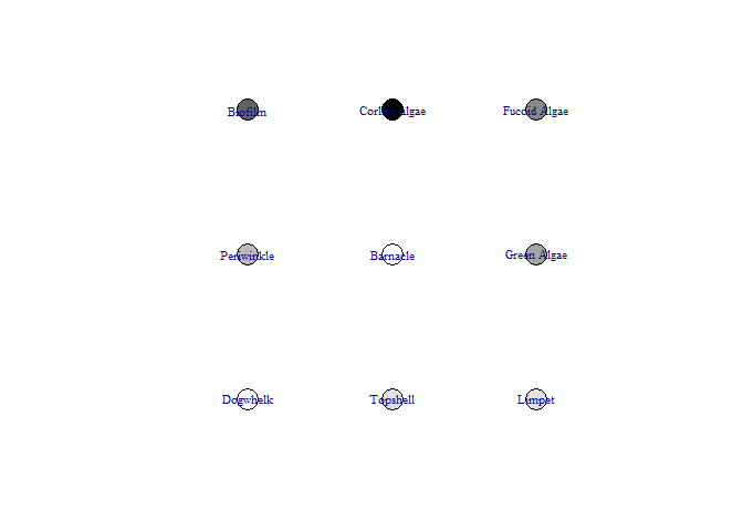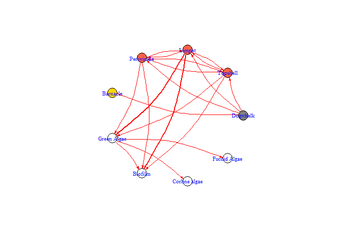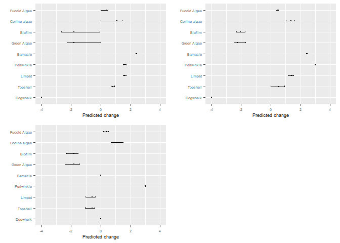 #> 9 0.3597076 Fucoid Algae 0.3597076 0.3597076The output given above shows the posterior outcome of the model as a result of dogwhelks decreasing - under the Increase column. Grazers increase (positive values) and some of the seaweeds which would be grazed by the grazers decreases. As the paper above explains, this is a short-term prediction model, so some seaweed actually increases in this scenario. There are also confidence intervals of our predictions - currently these show no difference to the main values, but we can bootstrap the model to gain an idea of the confidence of the predictions.