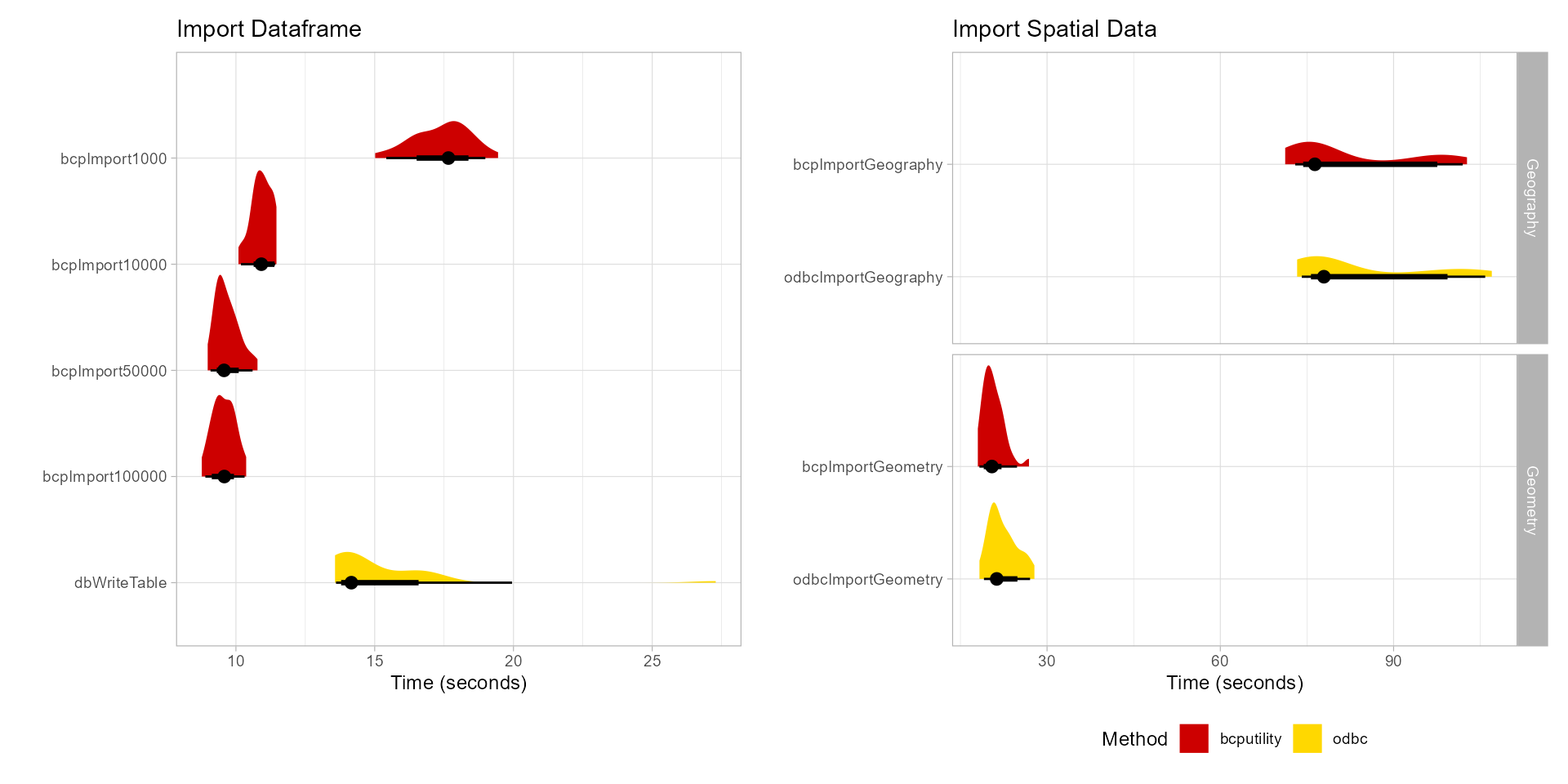bcputility is a wrapper for the command line utility program from SQL Server that does bulk imports/exports. The package assumes that bcp is already installed and is on the system search path. For large inserts to SQL Server over an ODBC connection (e.g. with the “DBI” package), writes can take a very long time as each row generates an individual insert statement. The bcp Utility greatly improves performance of large writes by using bulk inserts.
