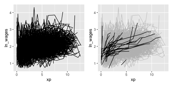 This helps you go from the “plate of spaghetti” plot on the left, to “interesting observations” plot on the right.