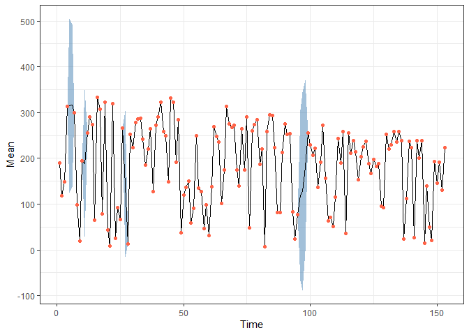 Now let’s assume that we also want to use the solar radiation variable as predictor for ozone. As it contains few missing values, we cannot use it directly. As the number of missing time points is very small, simple imputation would likely be acceptable, but let’s consider more another approach. For simplicity, the slope terms of the previous models are now omitted, and we focus on the Gaussian case. Let \(\mu_t\) be the true solar radiation at time \(t\). Now for ozone \(O_t\) we assume following model: