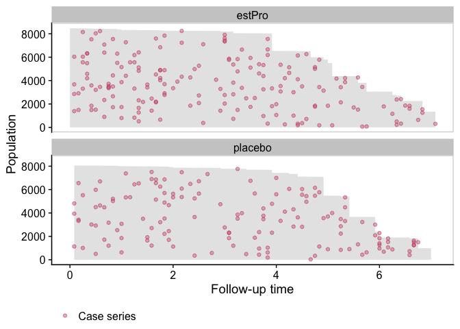 We first visualize the data with a population time plot. For each treatment arm, we plot the observed person time in gray, and the case series as colored dots. It gives us a good visual representation of the incidence density: