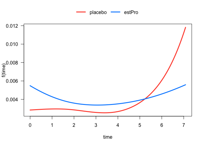 The treatment effect on the hazard is somewhat difficult to interpret because of its interaction with the spline term on time. In these situations, it is often more instructive to visualize the relationship. For example, we can easily plot the hazard function for each treatment arm: