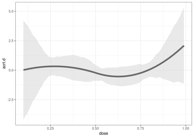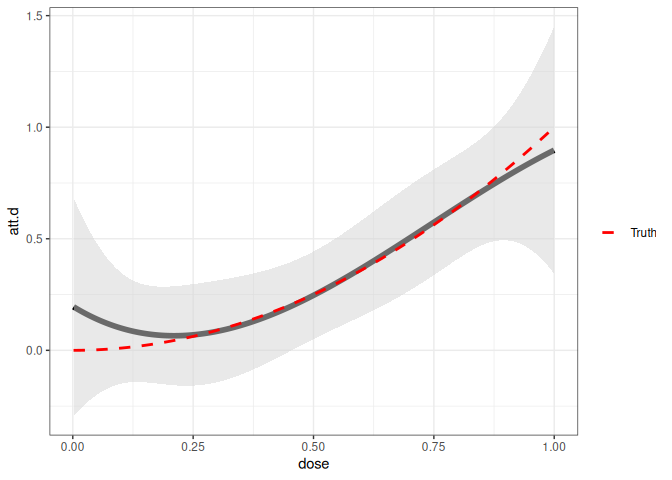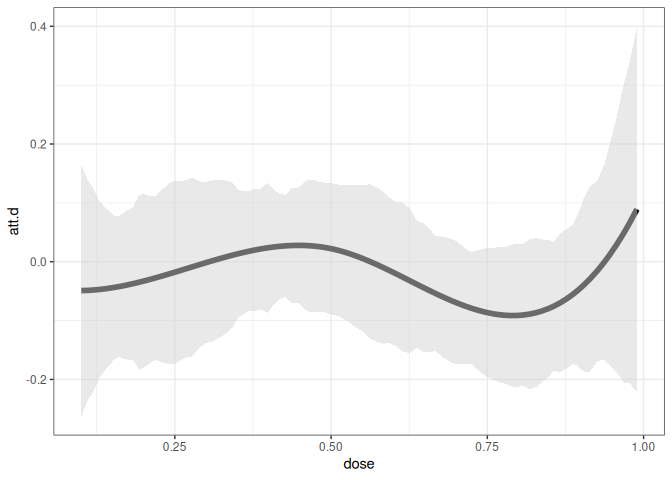 In most applications, it is hard to know the correct functional form for the treatment effects as a function of the dose. In Callaway, Goodman-Bacon, and Sant’Anna (2025), the approach we emphasize comes from Chen, Christensen, and Kankanala (2025), and the contdid package uses their npiv package to implement this approach. Code-wise, the only thing to change is to set the argument dose_est_method="cck". [Note that we currently only support this option for the case with two periods and no staggered adoption. With more periods, you can average the pre- and post-treatment periods to reduce it to a two period case and then run the code below; in fact, this is what we did in the application in our paper.]