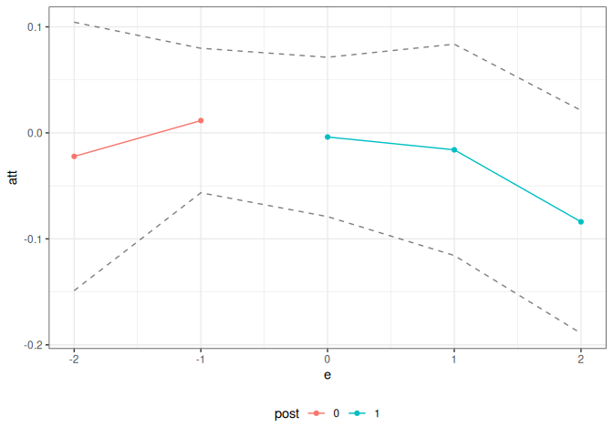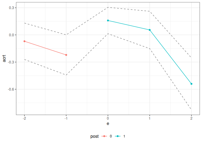 Notice that the target parameter is set level to target ATT, and the aggregation argument is set to eventstudy.