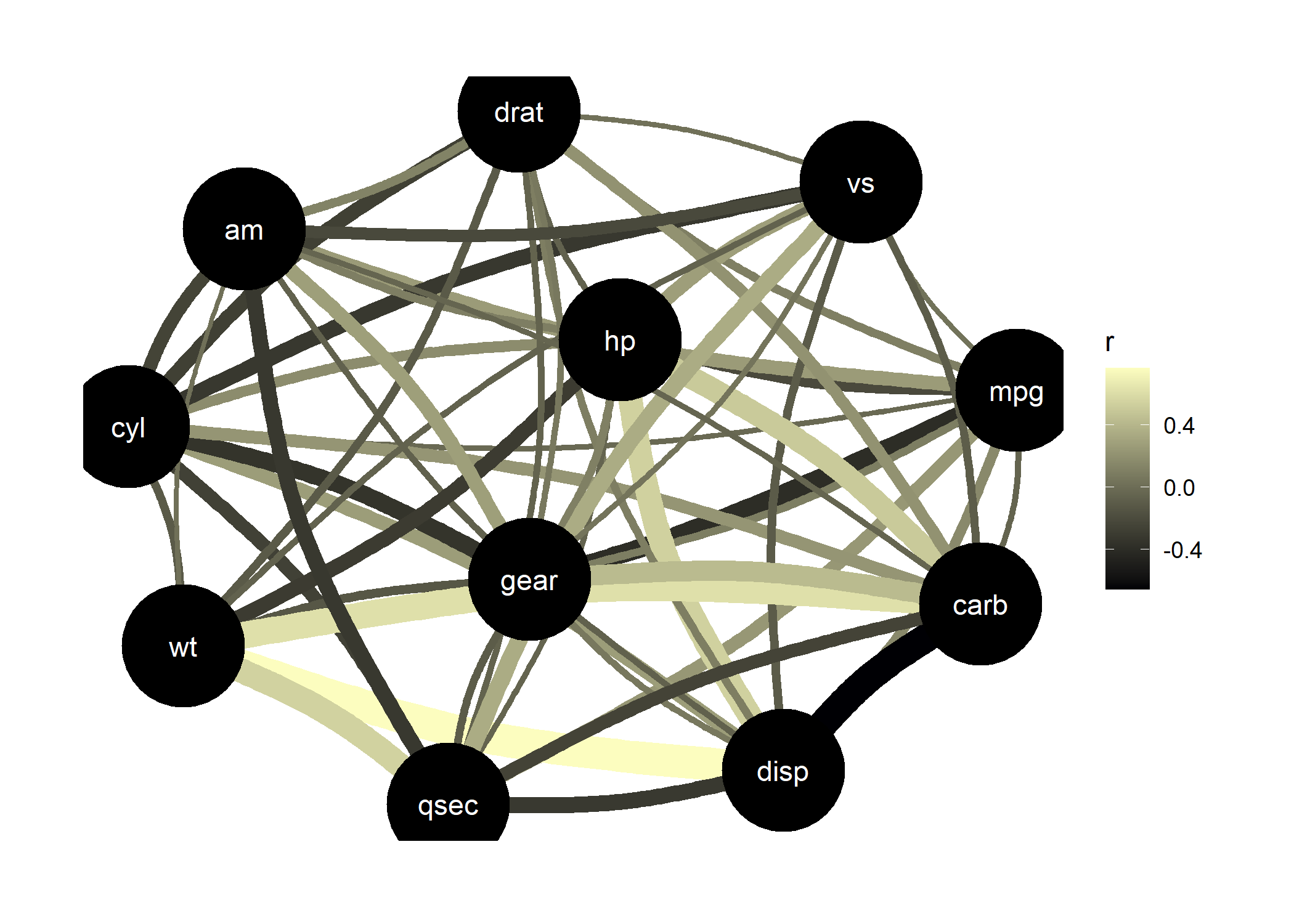Such partial correlations can also be represented as Gaussian Graphical Models (GGM), an increasingly popular tool in psychology. A GGM traditionally include a set of variables depicted as circles (“nodes”), and a set of lines that visualize relationships between them, which thickness represents the strength of association (see Bhushan et al., 2019).