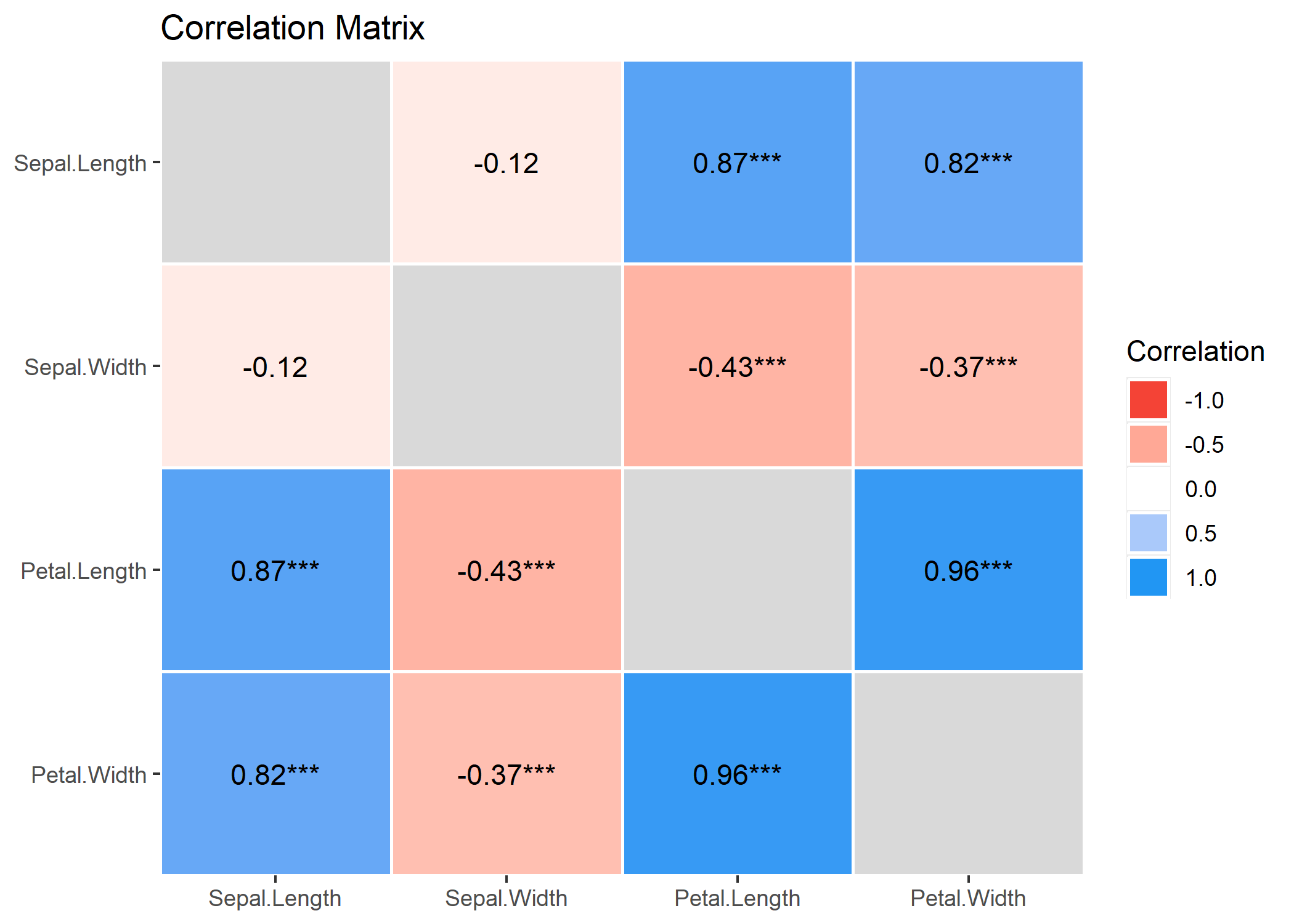 ## Sepal.Length |              |       -0.12 |      0.87*** |     0.82***