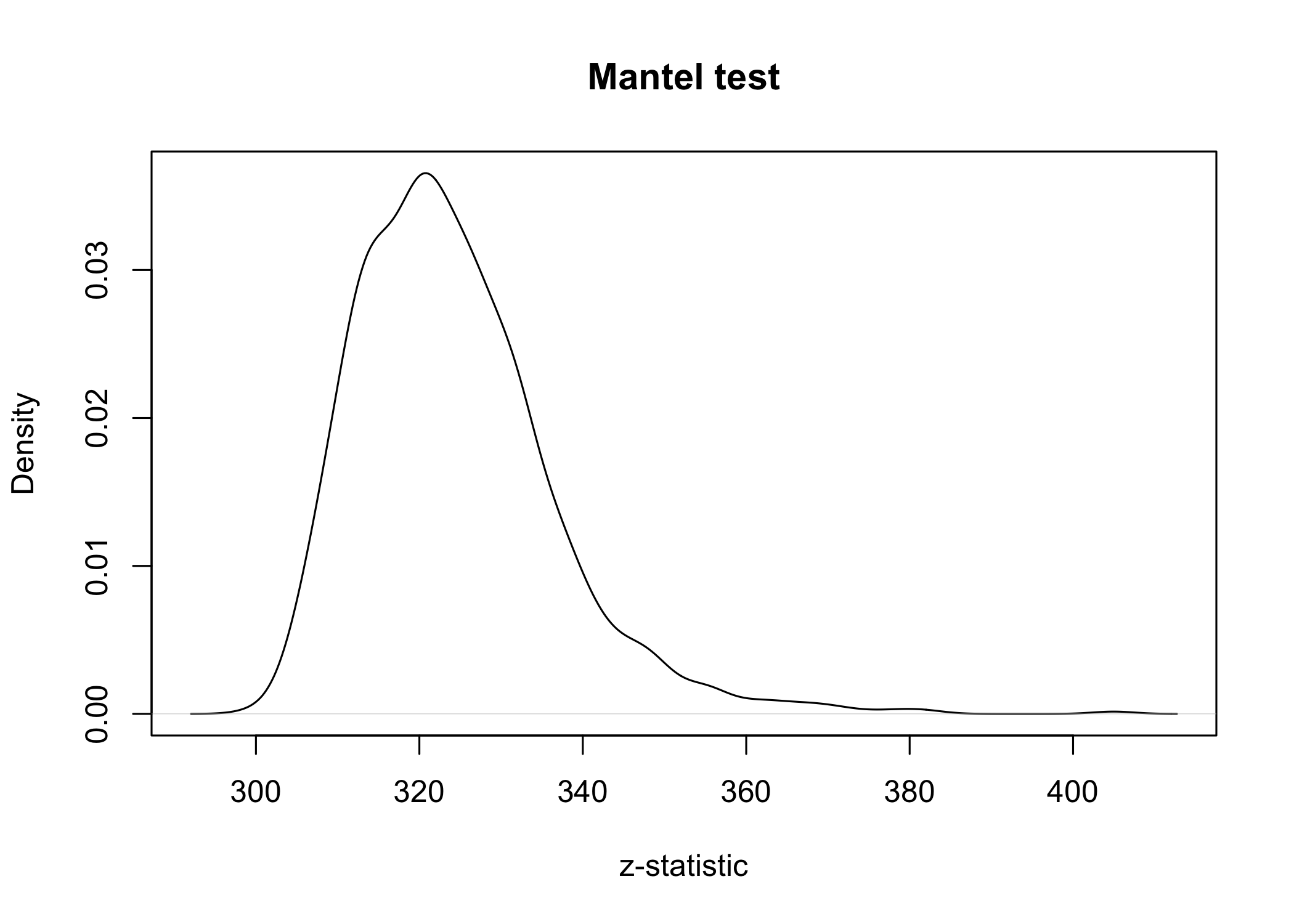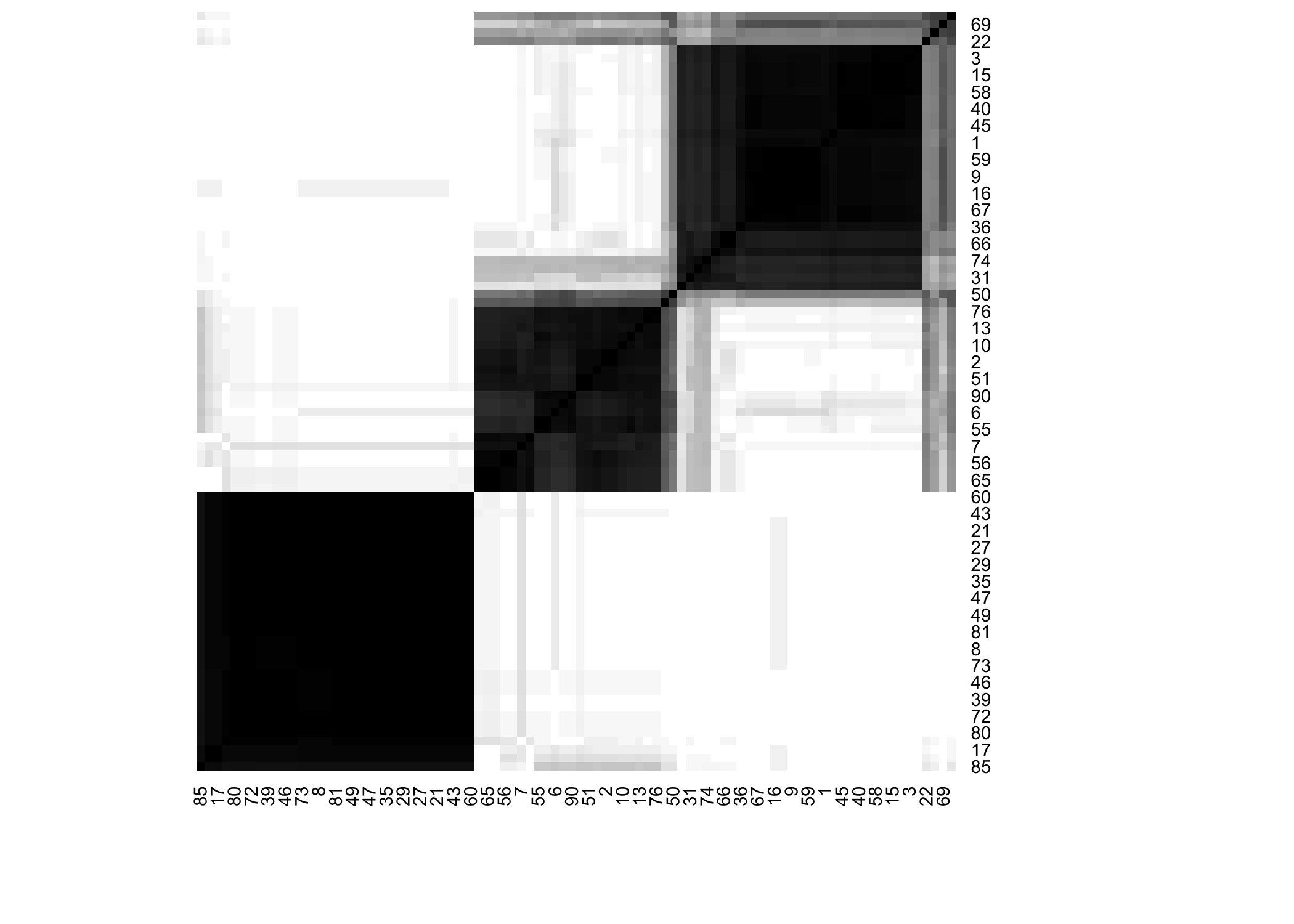 #> [1] 0.9324973To evaluate how well our tree captures the structure of the RF and replicates its classification, we introduce a procedure to measure the goodness of explainability. We start by visualizing the final partition generated by the RF through a heatmap — a graphical representation of the co-occurrence matrix, which reflects how often pairs of observations are grouped together across the ensemble. Each cell shows a pairwise similarity: the darker the cell, the closer to 1 the similarity — meaning the two observations were frequently assigned to the same leaf. Comparing these two matrices — both visually and statistically — allows us to assess how well E2Tree reproduces the ensemble structure. To formally test this alignment, we use the Mantel test, a statistical method that quantifies the correlation between the two matrices. The Mantel test is a non-parametric method used to assess the correlation between two distance or similarity matrices. It is particularly useful when we are interested to study the relationships between dissimilarity structures. The test uses permutation to generate a null distribution, comparing the observed statistic against values obtained under random reordering.