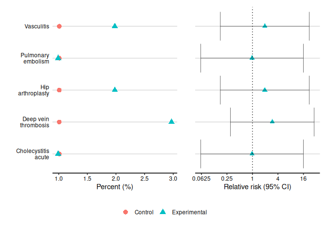 #> 4              Vascular disorders Deep vein thrombosis   2.94 (0.301, 28.8)