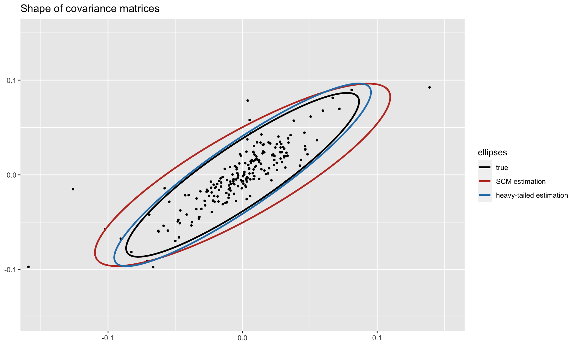 #> [1] 4.663539To get a visual idea of the robustness, we can plot the shapes of the covariance matrices (true and estimated ones) on two dimensions. Observe how the heavy-tailed estimation follows the true one more closely than the sample covariance matrix: