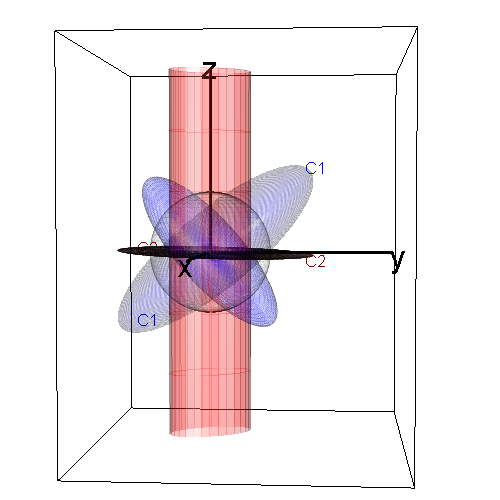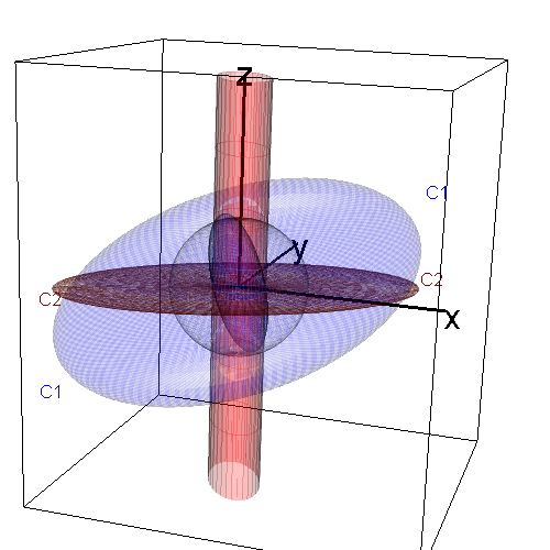 The following figure shows views of two generalized ellipsoids. C_1 (blue) determines a proper, fat ellipsoid; it’s inverse C_1^{-1} also generates a proper ellipsoid. C_2 (red) determines an improper, flat ellipsoid, whose inverse C_2^{-1} is an unbounded cylinder of elliptical cross-section. C_2 is the projection of C_1 onto the plane where z = 0. The scale of these ellipsoids is defined by the gray unit sphere.