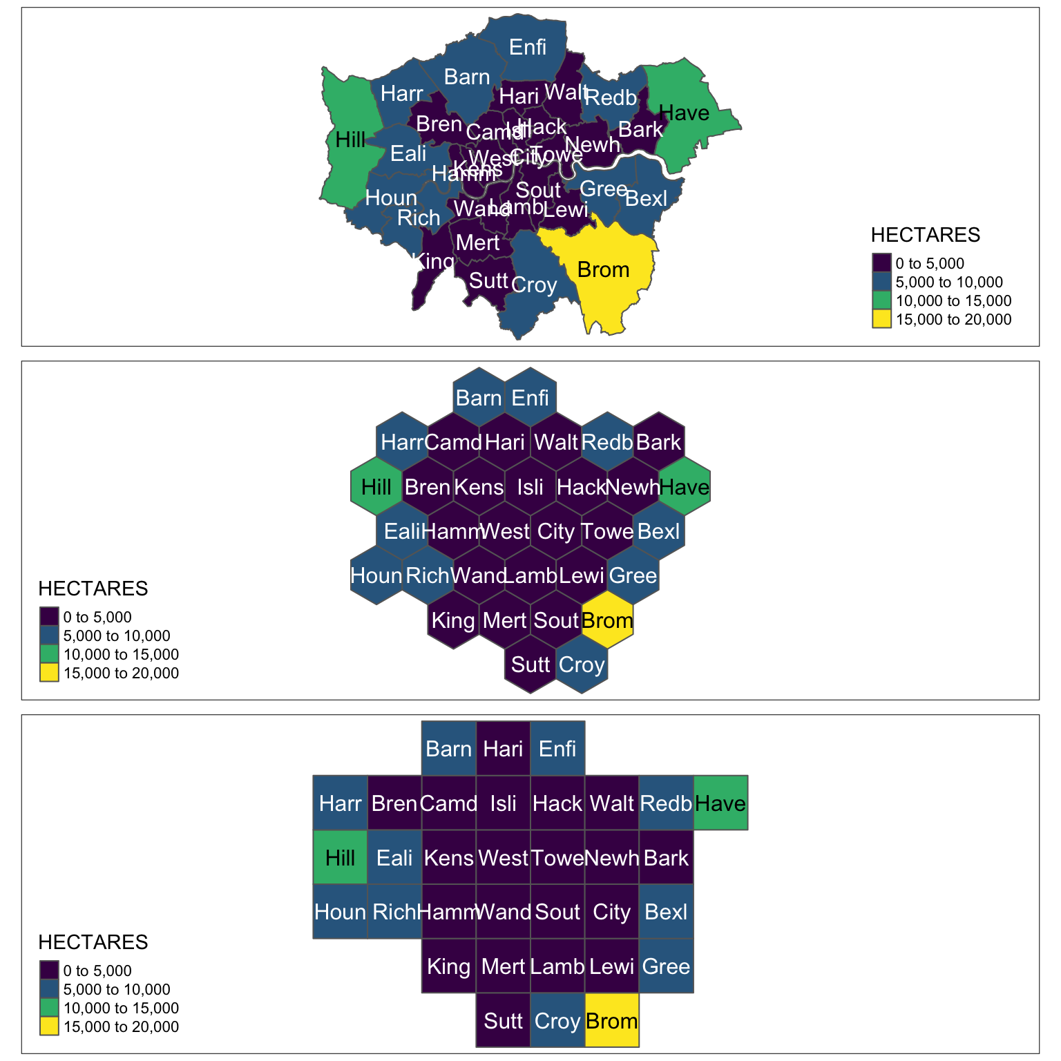 tmap_arrange(rawplot2, hexplot2, regplot2, nrow = 3)