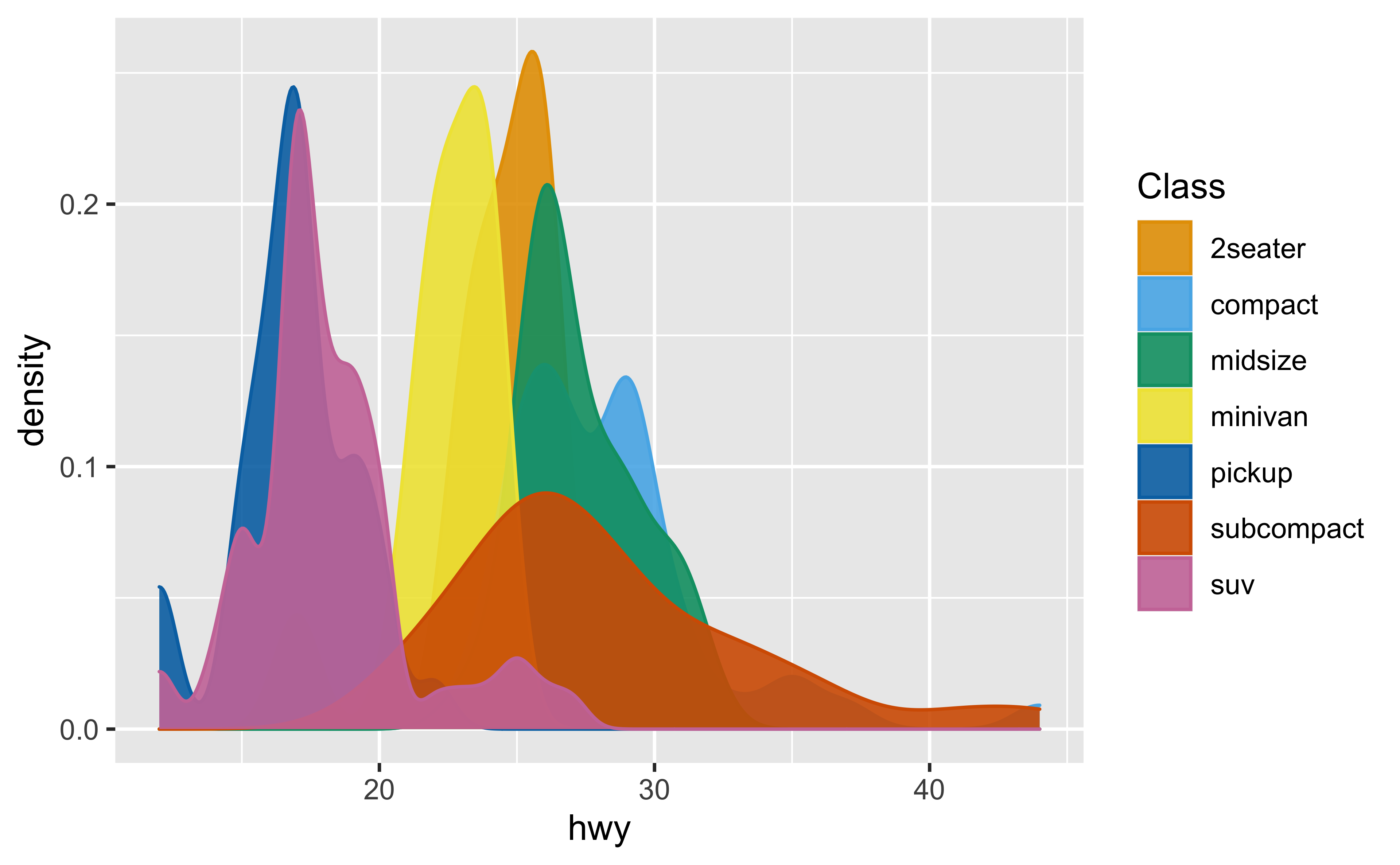 ggplot(mpg, aes(hwy, color = class, fill = class)) +