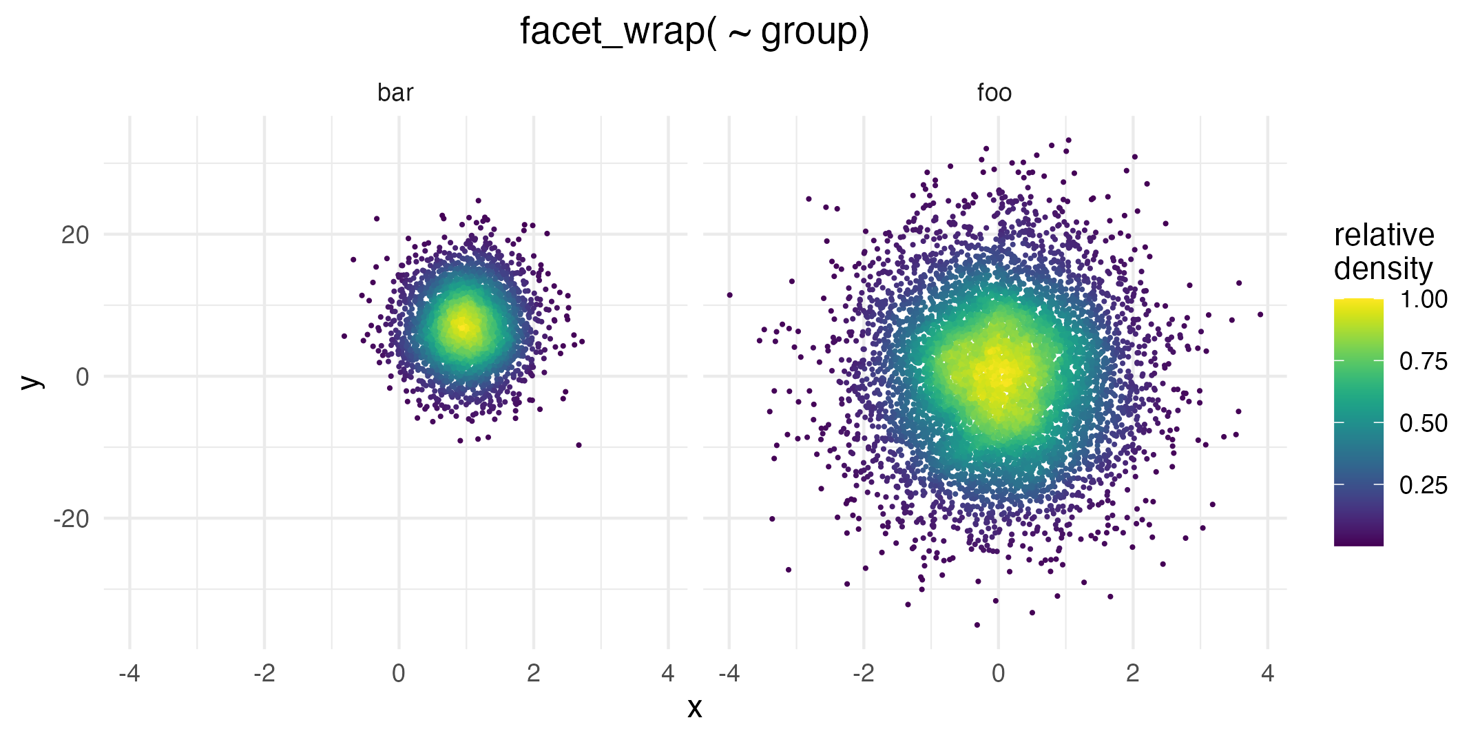 Even though the foo data group is not as dense as bar overall, this plot uses the whole color scale between 0 and 1 in both facets.