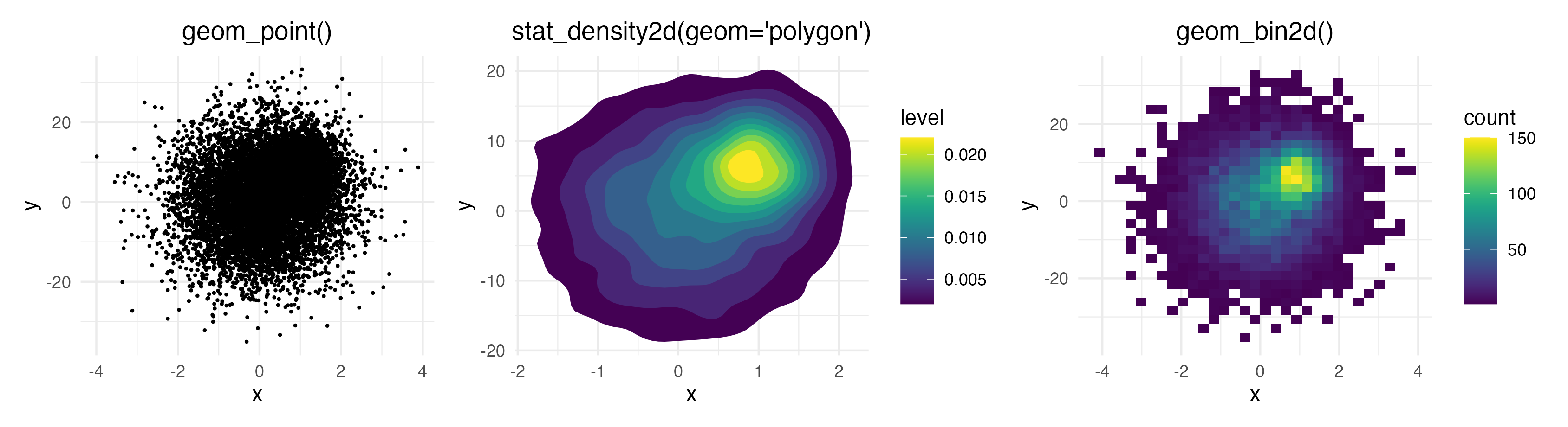 There are several ways to visualize data points on a 2D coordinate system: If you have lots of data points on top of each other, geom_point() fails to give you an estimate of how many points are overlapping. geom_density2d() and geom_bin2d() solve this issue, but they make it impossible to investigate individual outlier points, which may be of interest.