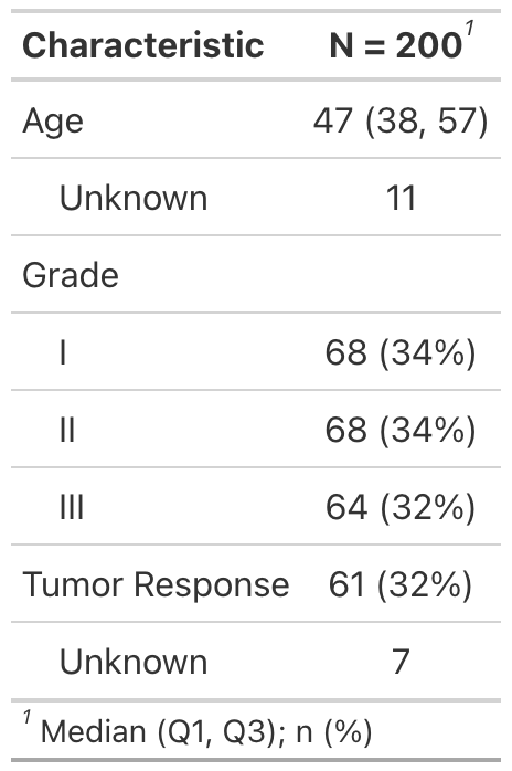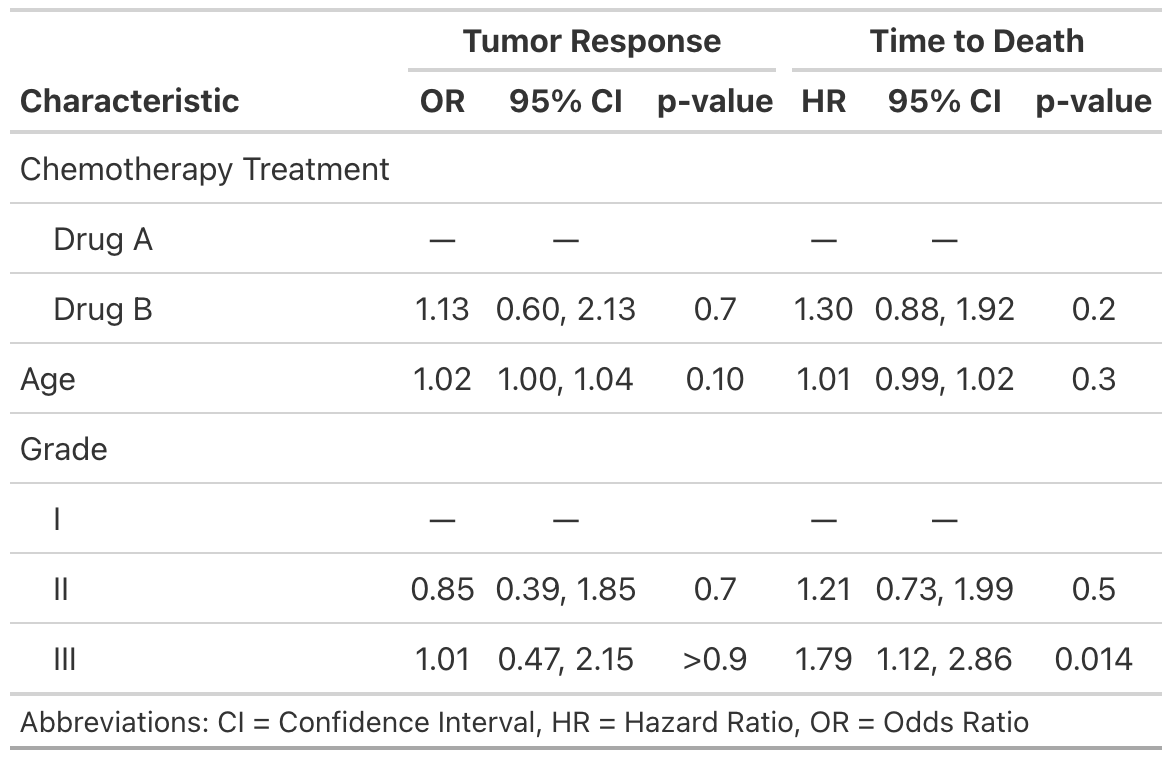 tab_spanner = c("**Tumor Response**", "**Time to Death**")