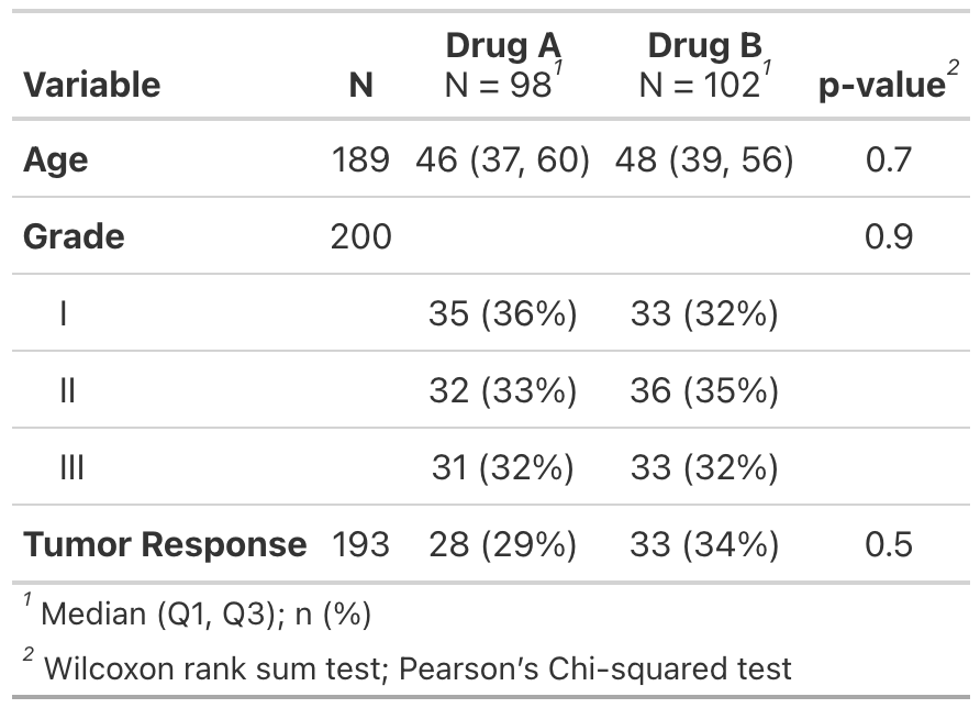 The {gtsummary} package provides an elegant and flexible way to create publication-ready analytical and summary tables using the R programming language. The {gtsummary} package summarizes data sets, regression models, and more, using sensible defaults with highly customizable capabilities.