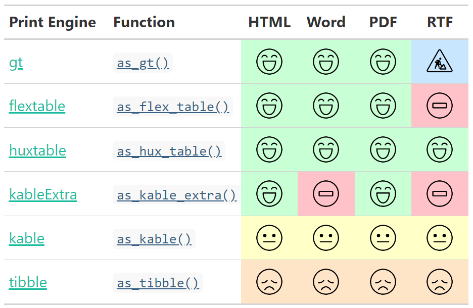 The {gtsummary} package was written to be a companion to the {gt} package from RStudio. But not all output types are supported by the {gt} package. Therefore, we have made it possible to print {gtsummary} tables with various engines.