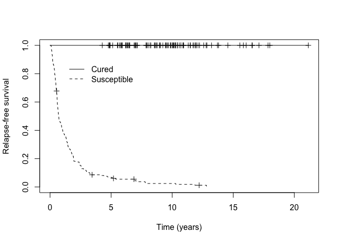 Then we can assess how well our MCM identified patients likely to be cured from those likely to be susceptible visually by examining the Kaplan-Meier curves.