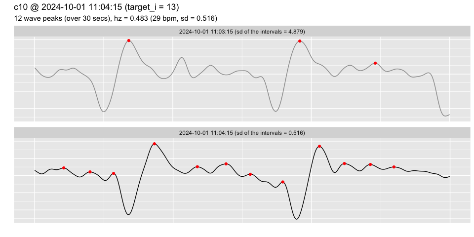 #> # ℹ 3 more variables: d_r <dbl>, d_f <lgl>, keep <lgl>It’s important to check the quality of the data and of the heart beat frequency estimates.