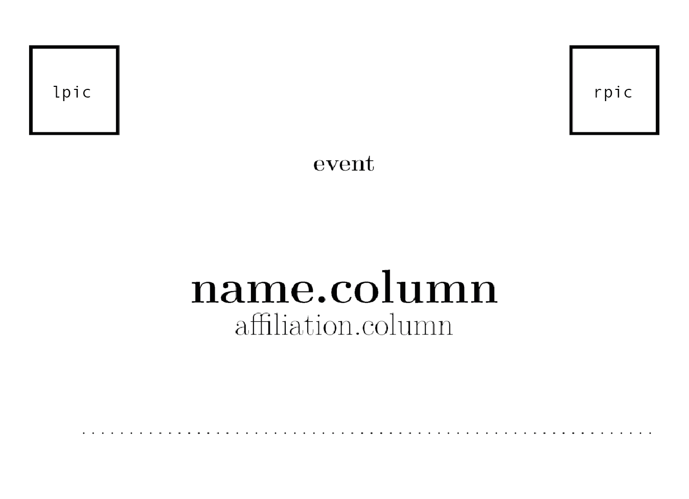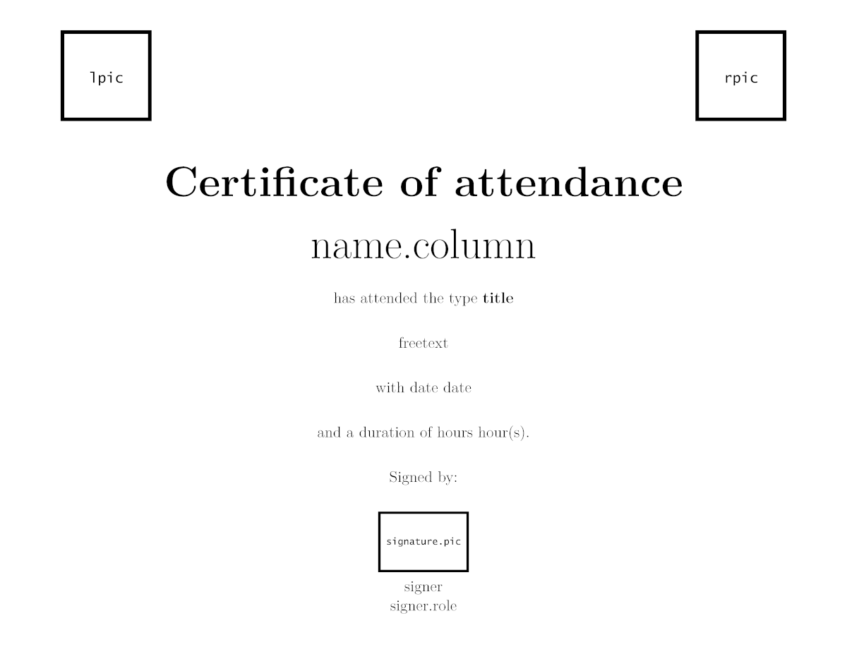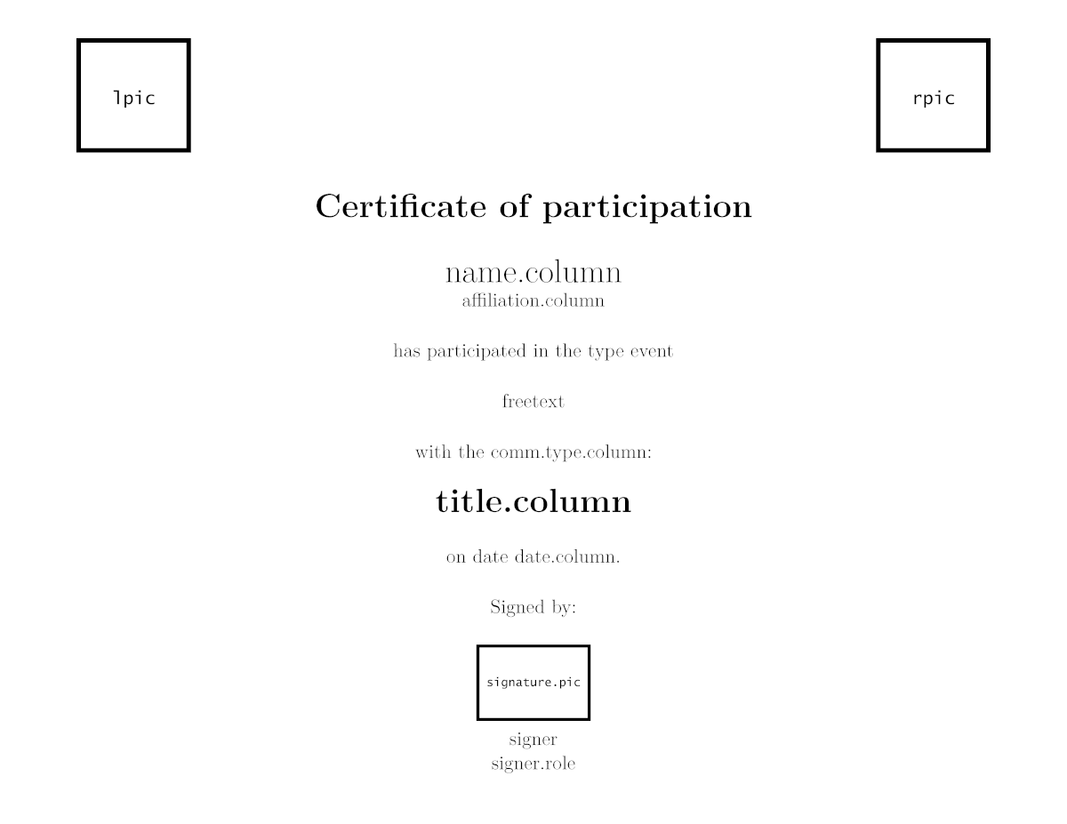 Pictures (such as logos or signatures) are included in some templates. For these, argument names are lpic (standing for left picture, in the top), rpic (right picture, also in the top), signature.pic (signature picture) in the certificates, and logo in the collection label. In all these cases the path to the picture file must be provided.