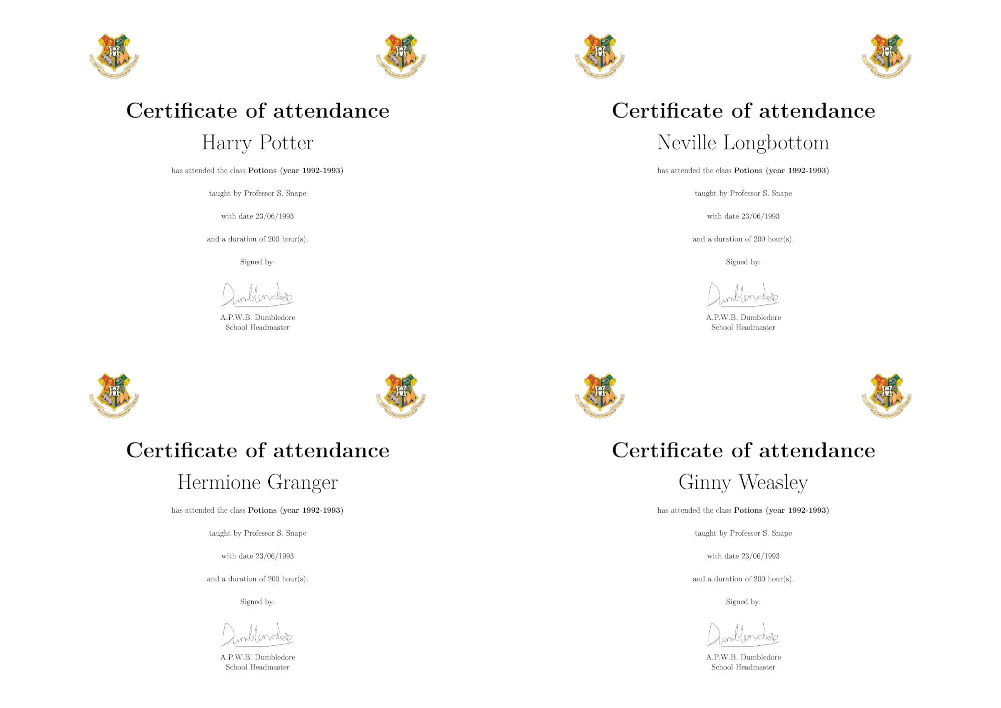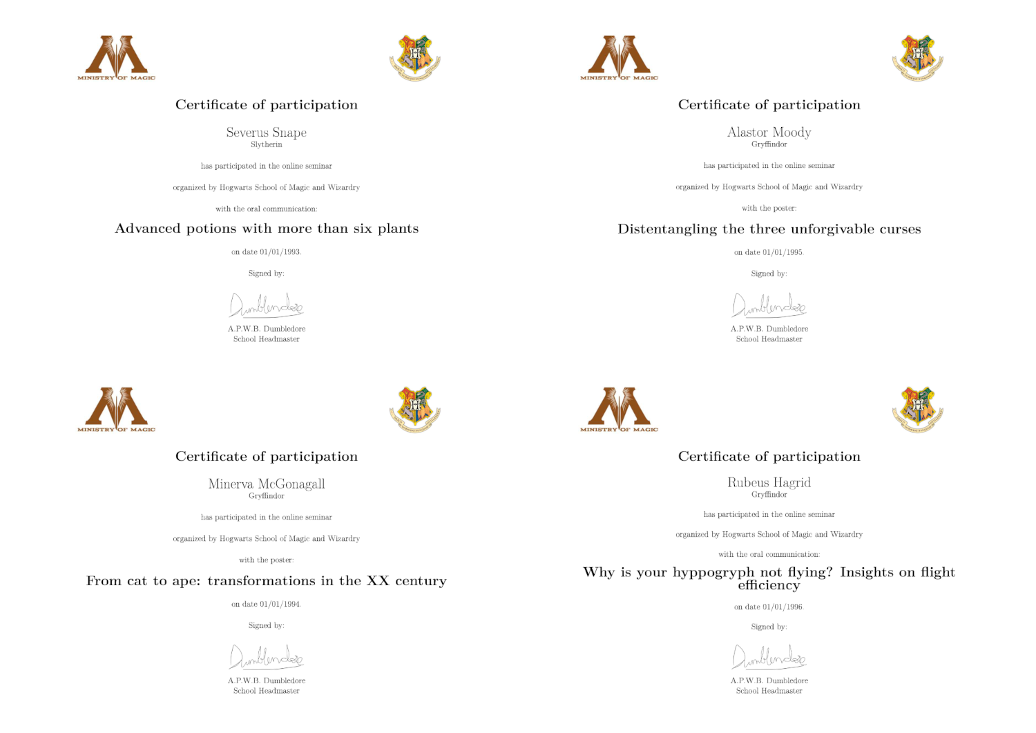 Here, Albus Dumbledore certifies that four of the school teachers have participated in some seminars with different titles, different affiliations, dates and communication types.