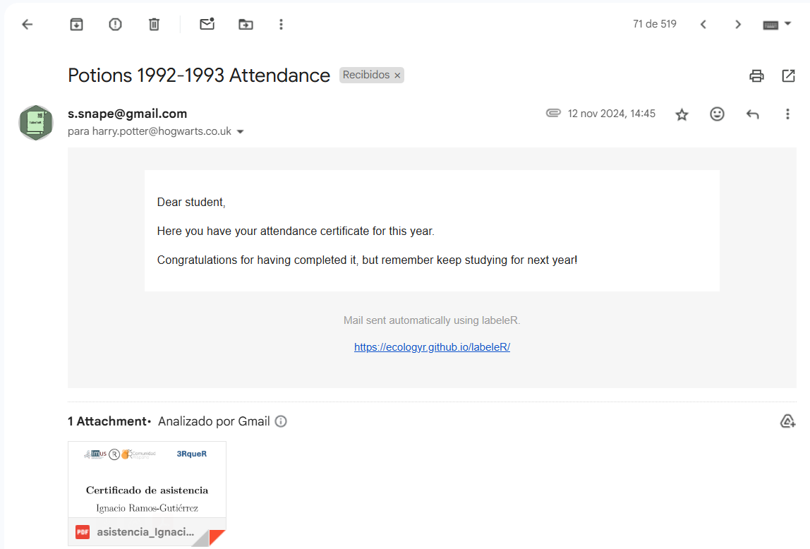 Sending attendance or participation certificates one by one by hand can be a real nightmare, so labeleR can do it for you (do not get scared, it is really easy!). The only things you need are a gmail account and all the recipient mail addresses stored in a column of your data frame.