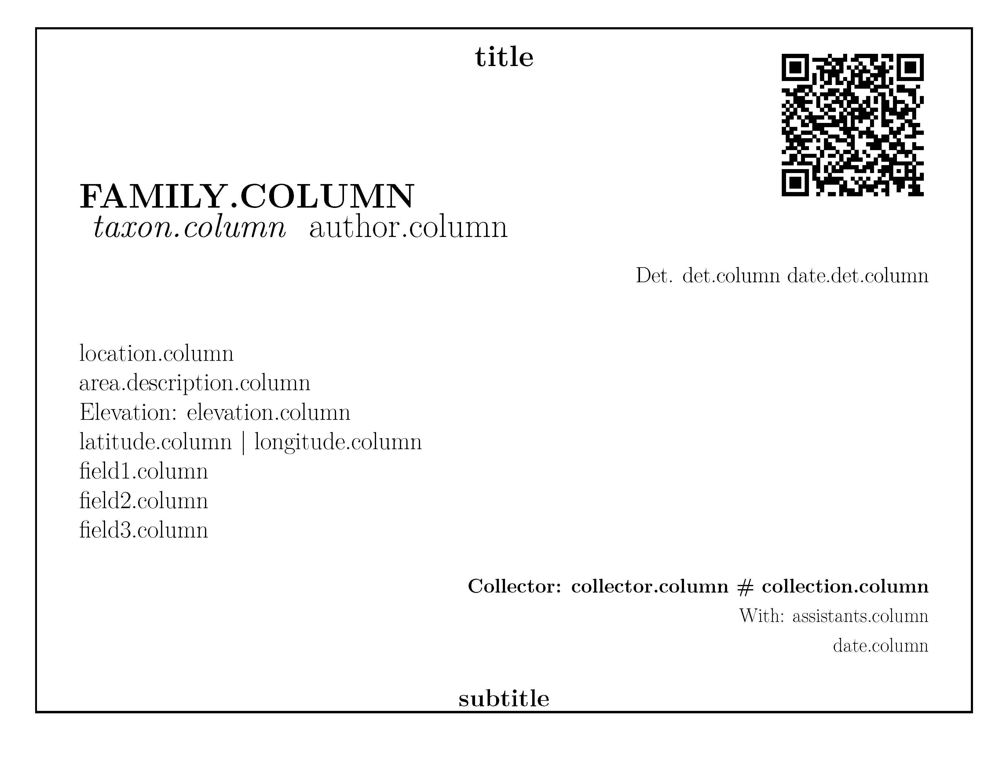 Collection labels are one of the most aesthetic labels. They have five variable parameters (which are not recommended to be too long, as explained in the herbarium labels), along with the possibility of including a QR code (fixed or variable), an image (logo or picture). Field 1 will be always capitalized (as in family.column in the herbarium label), and Field 2 italicized. Any field can be left blank.