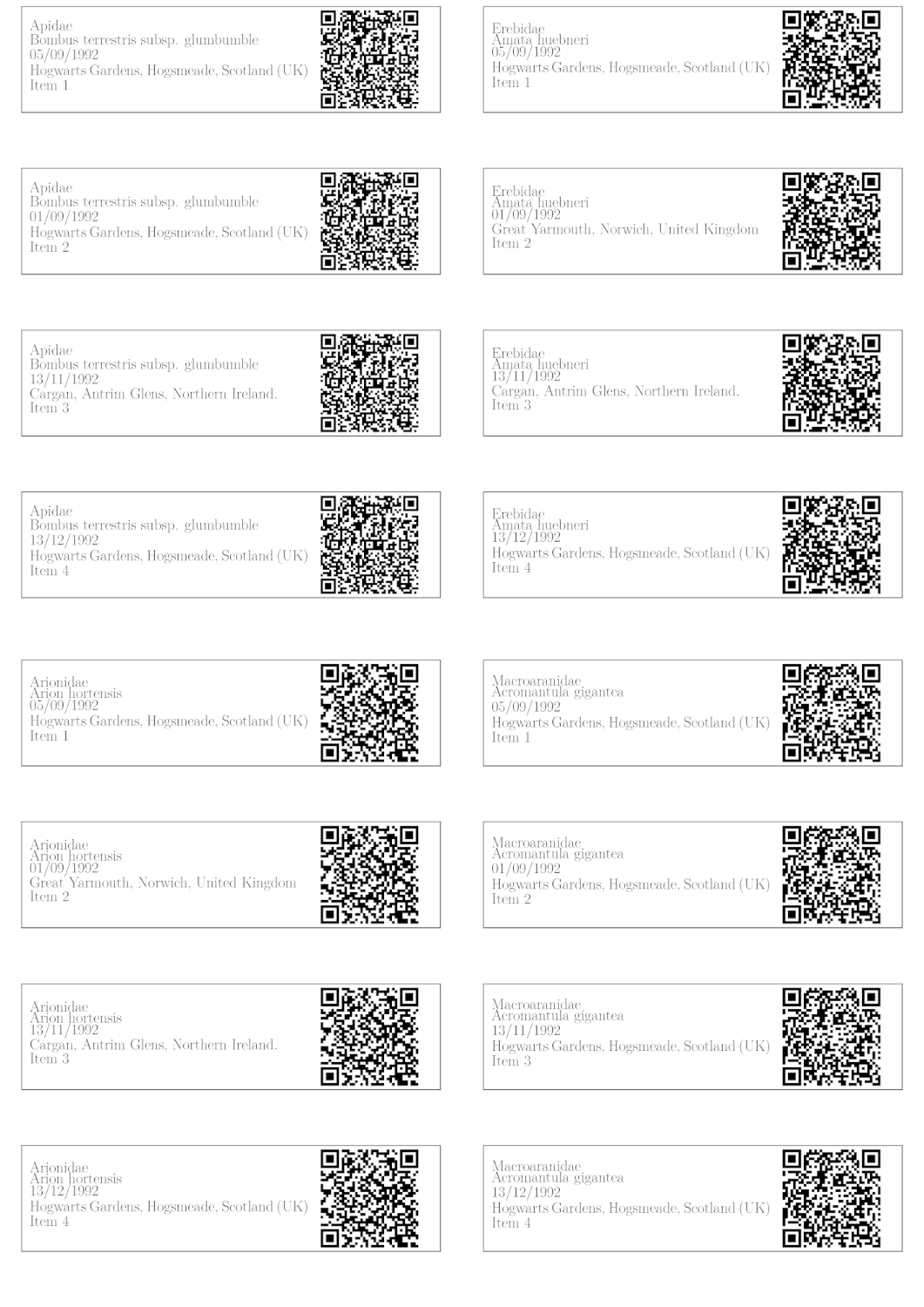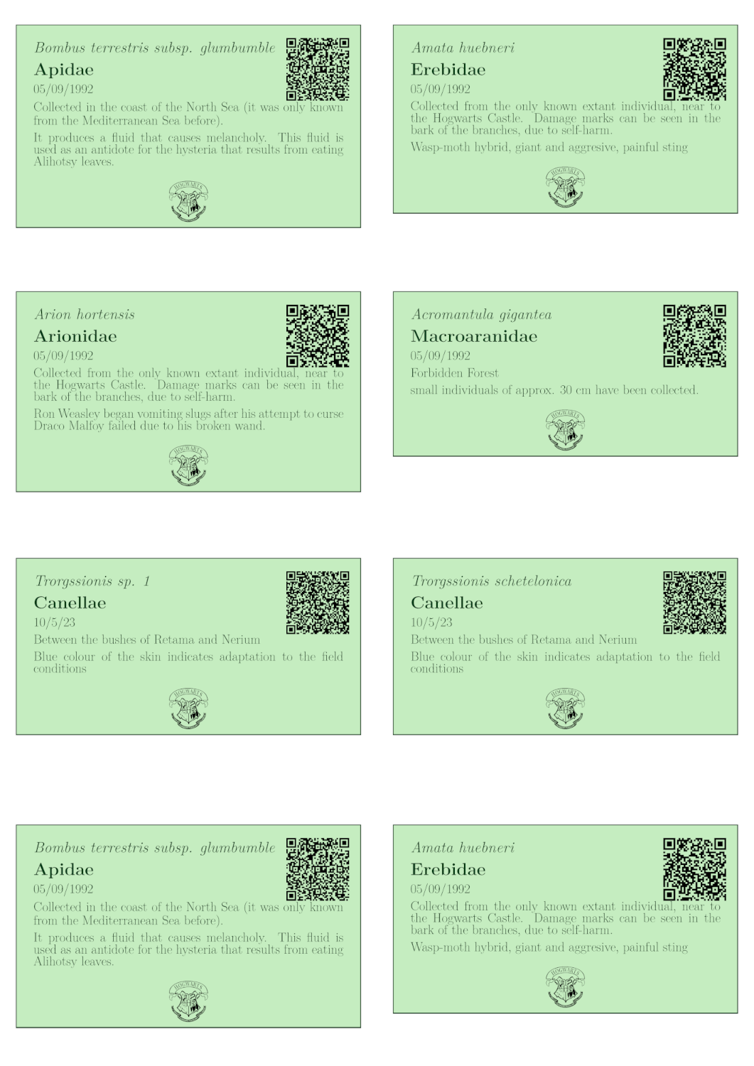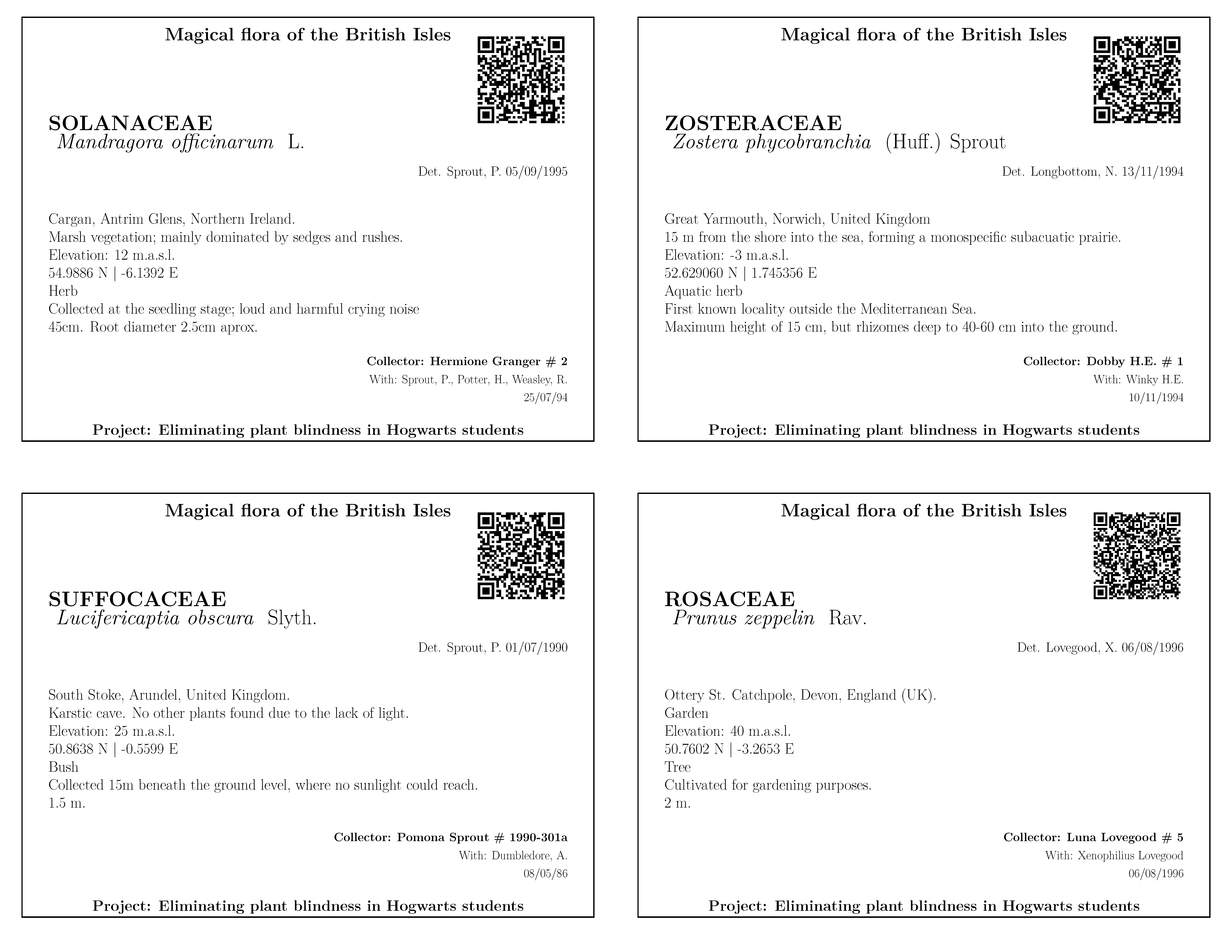 In this example, we show the labels some students have created for their herbarium assignment of the Herbology class.