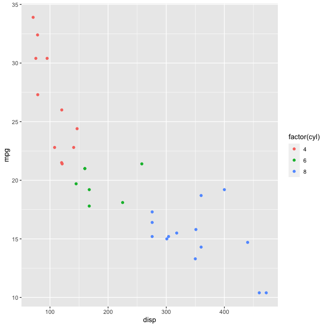 plot_scatter(mtcars, disp, mpg, color = factor(cyl))