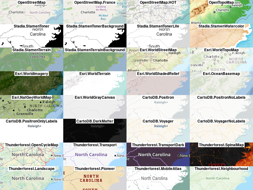 The following figure shows mini maps for most of the tiles providers available: