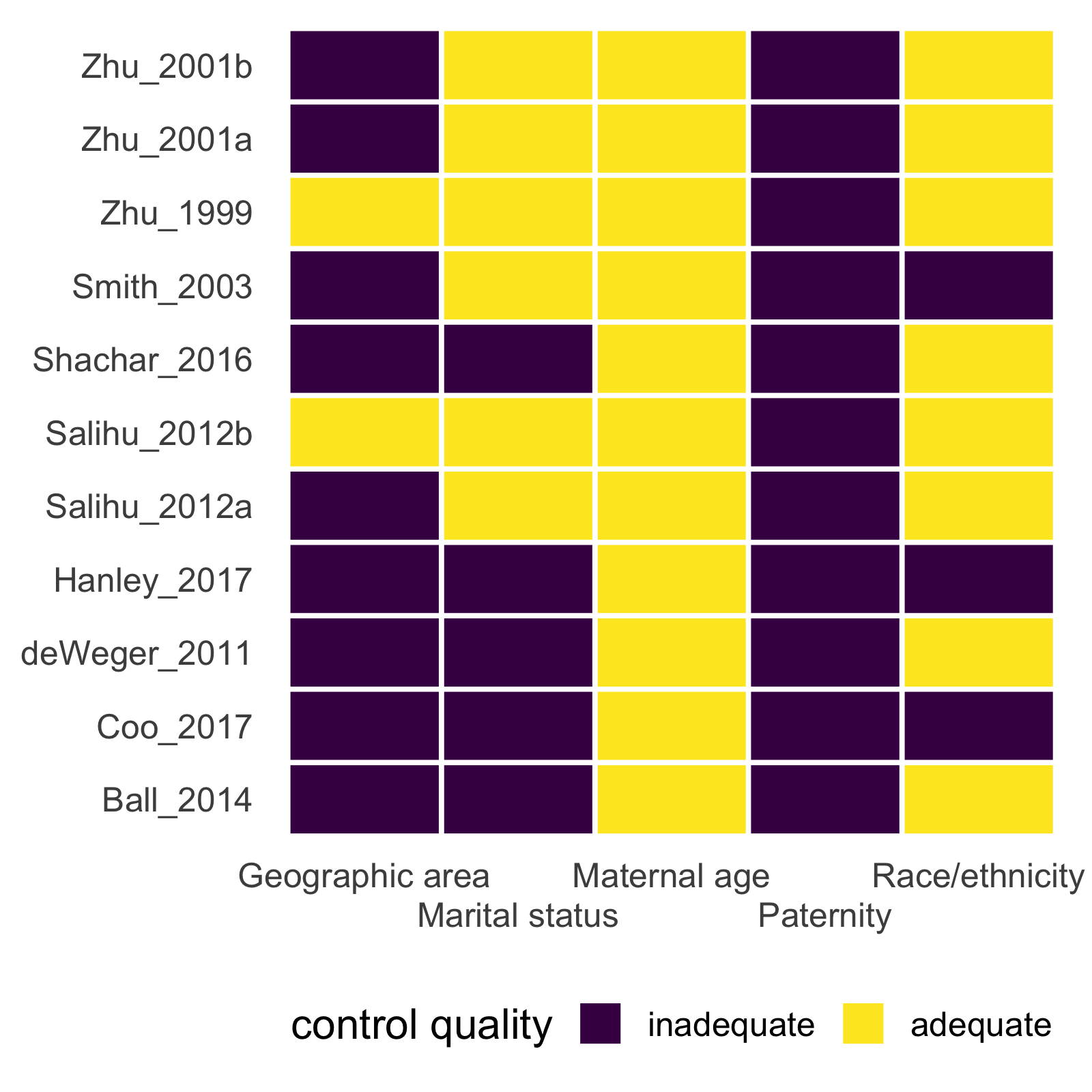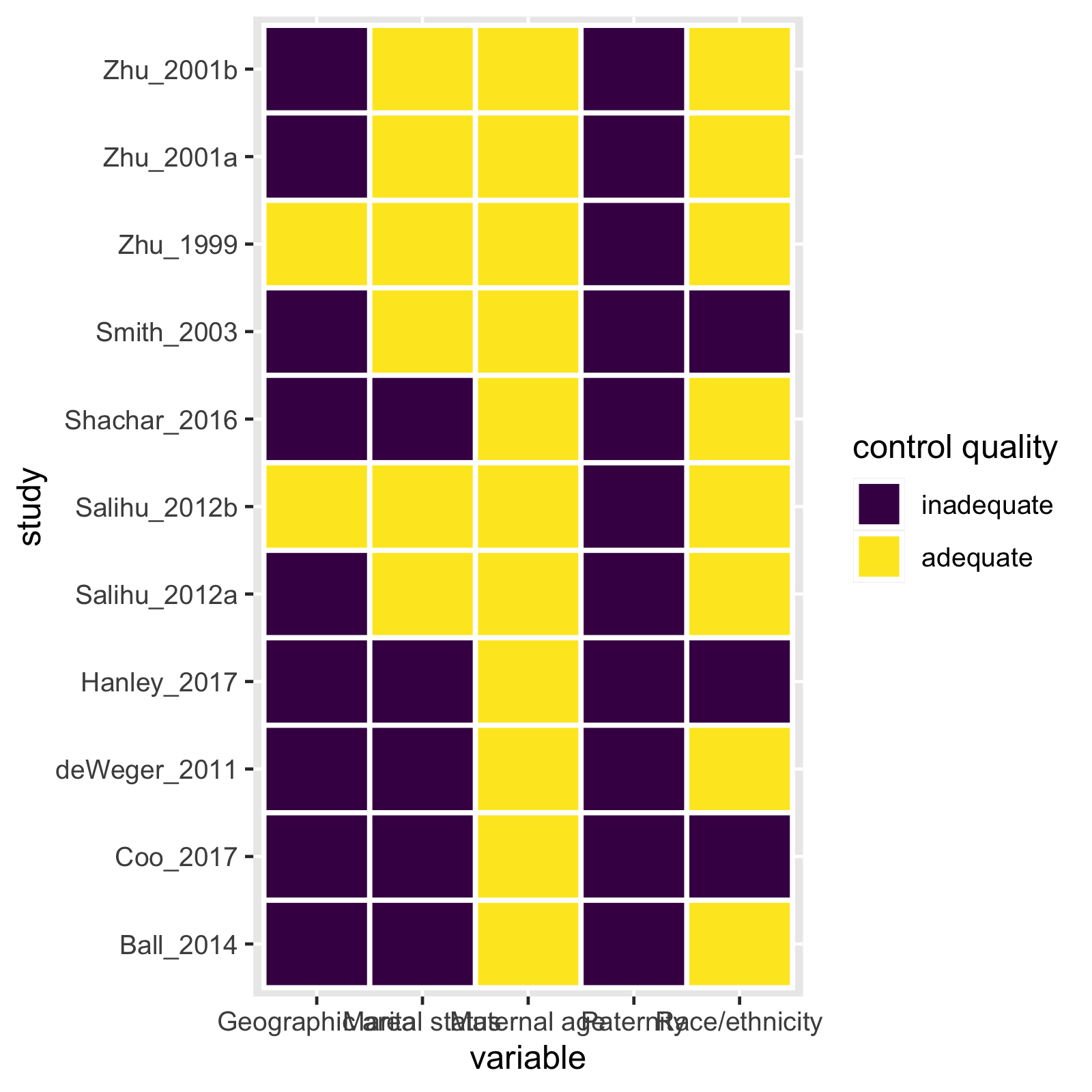 #> 1 Sociodemographics Maternal age Y Zhu_2001a adequate