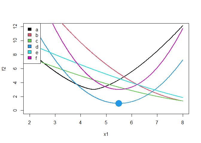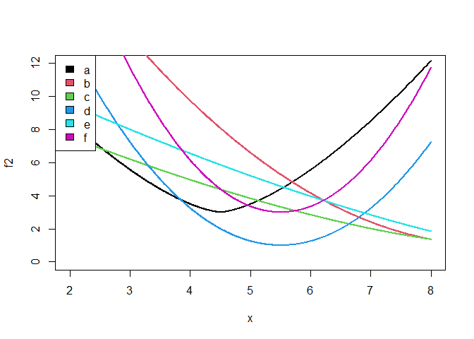 Suppose you have a function, called f2, that takes in two arguments. The first is a continuous numeric value between 2 and 8. The second is a discrete factor that can on the values ‘a’, ‘b’, ‘c’, ‘d’, ‘e’, or ‘f’.