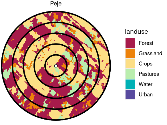 A common landscape-scale study comprises the evaluation of a variable or process (e.g. species richness or any ecological response) along a set of landscapes varying in one or more attributes (e.g. the amount of natural habitat). Usually, this evaluation is made through the definition of several spatial-scales. Multi-scale landscapes can be defined as concentric circular buffers around a central point (each of the evaluated sites). There are plenty of examples for this experimental design in the literature, such as De Camargo et al. (2018), Melo et al., (2017) or Verga et al. (2021).