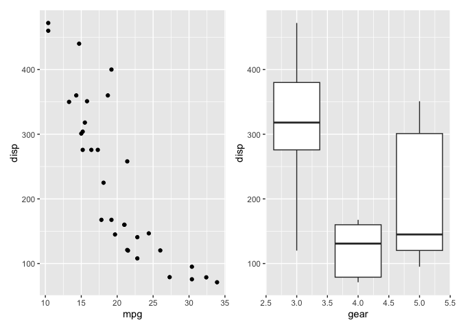 p2 <- ggplot(mtcars) + geom_boxplot(aes(gear, disp, group = gear))