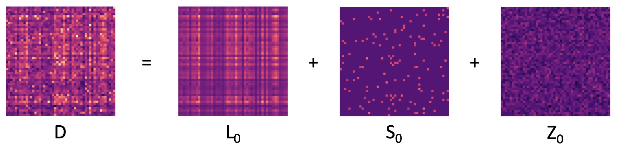 a low-rank matrix \(L_0\) encoding consistent patterns of exposure, a sparse matrix \(S_0\) isolating unique or outlying exposure events (that cannot be explained by the consistent exposure patterns), and dense noise \(Z_0\).