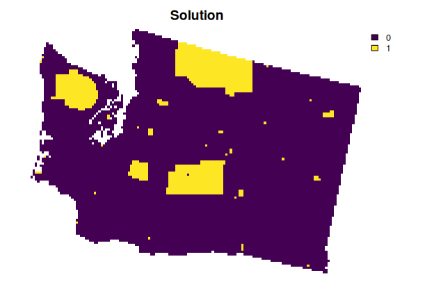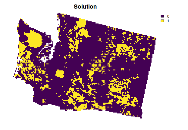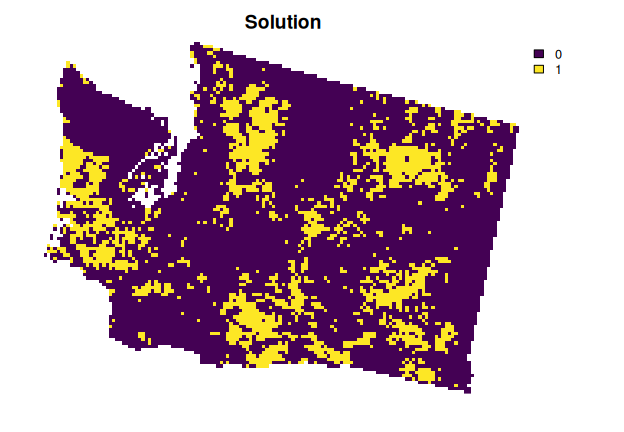 Now, let’s generate a spatial prioritization. To ensure feasibility, we will set a budget. Specifically, the total cost of the prioritization will represent a 5% of the total land value in the study area. Given this budget, we want the prioritization to increase feature representation, as much as possible, so that each feature would, ideally, have 20% of its distribution covered by the prioritization. In this scenario, we can either purchase all of the land inside a given planning unit, or none of the land inside a given planning unit. Thus we will create a new problem() that will use a minimum shortfall objective (via add_min_shortfall_objective()), with relative targets of 20% (via add_relative_targets()), binary decisions (via add_binary_decisions()), and specify that we want near-optimal solutions (i.e., 10% from optimality) using the best solver installed on our computer (via add_default_solver()).