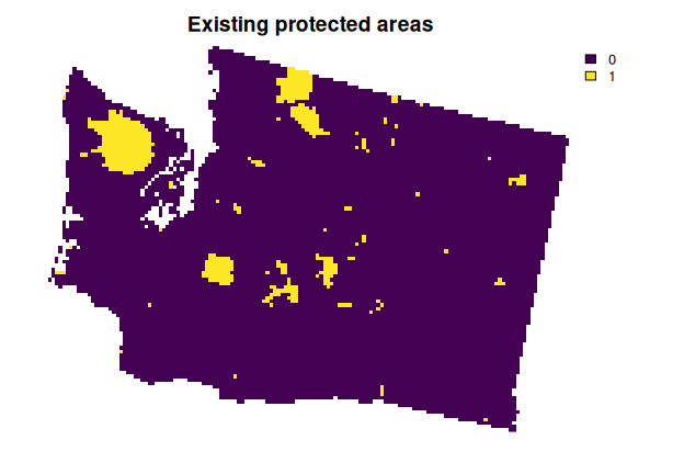 Although this solution helps meet the representation targets, it does not account for existing protected areas inside the study area. As such, it does not account for the possibility that some features could be partially – or even fully – represented by existing protected areas and, in turn, might fail to identify meaningful priorities for new protected areas. To address this issue, we will use the get_wa_locked_in() function to import spatial data for protected areas in the study area. We will then add constraints to the problem() to ensure they are selected by the solution (via add_locked_in_constraints()).