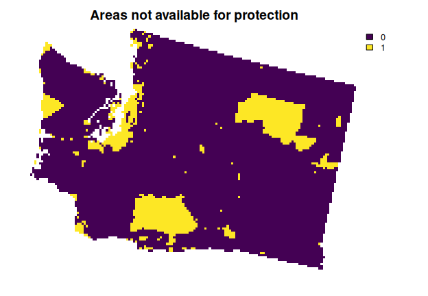 plot(wa_locked_out, main = "Areas not available for protection", axes = FALSE)