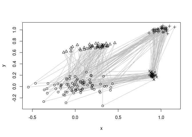 repos = c("https://mhahsler.r-universe.dev". "https://cloud.r-project.org/"))We use a artificial dataset with a mixture of four clusters components. Points are generated using a fixed sequence <1,2,1,3,4> through the four clusters. The lines below indicate the sequence.