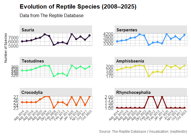 The goal of reptiledbr is to facilitate access to reptile taxonomy, nomenclature, distribution, and associated scientific literature in a reproducible and efficient way for researchers, ecologists, educators, and biodiversity data users.