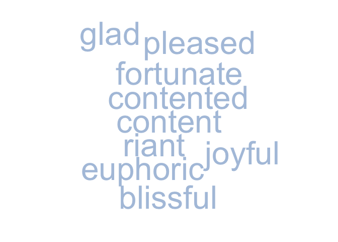 #> [1] "door hinge"Feeling down? How about this cloud of words with similar meaning to happy: