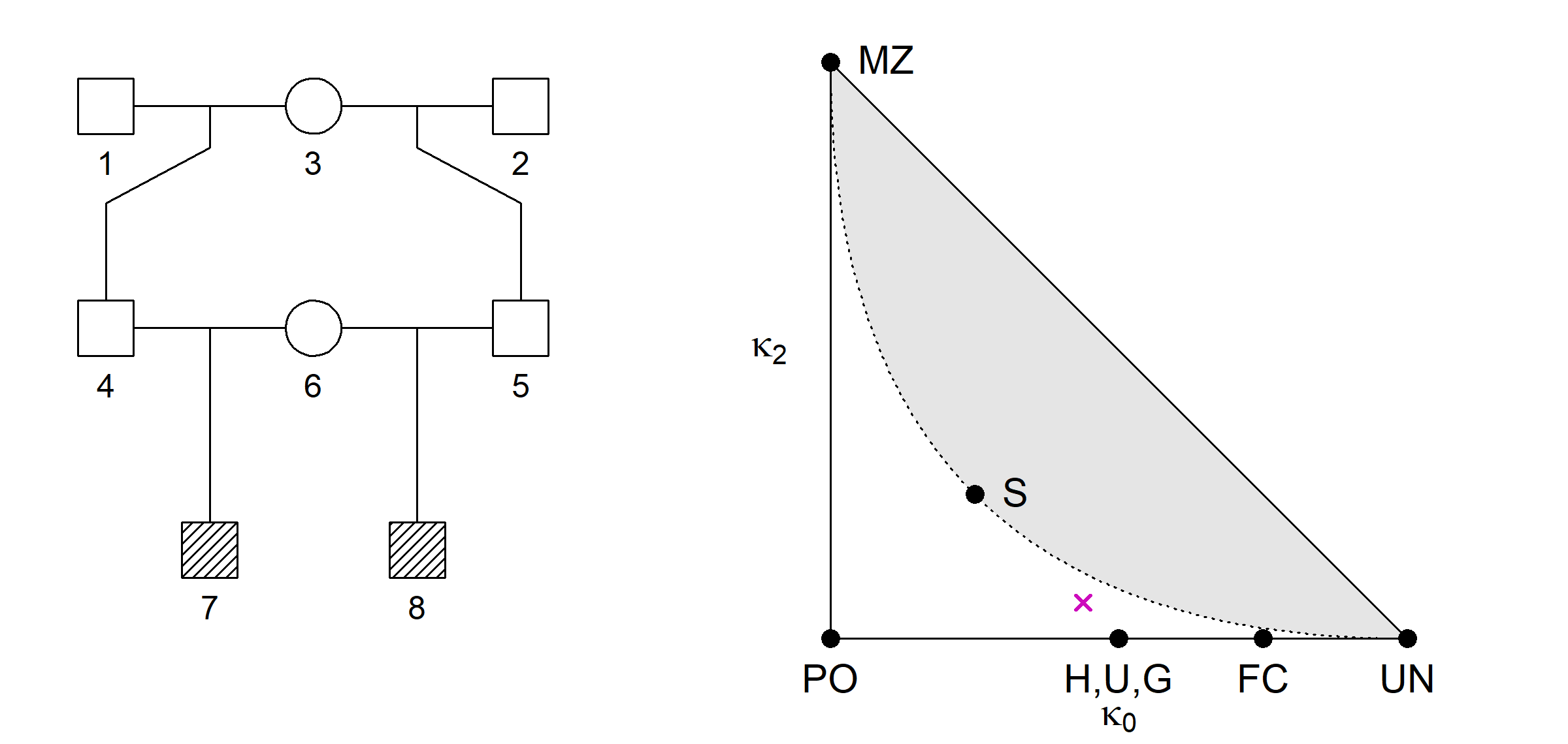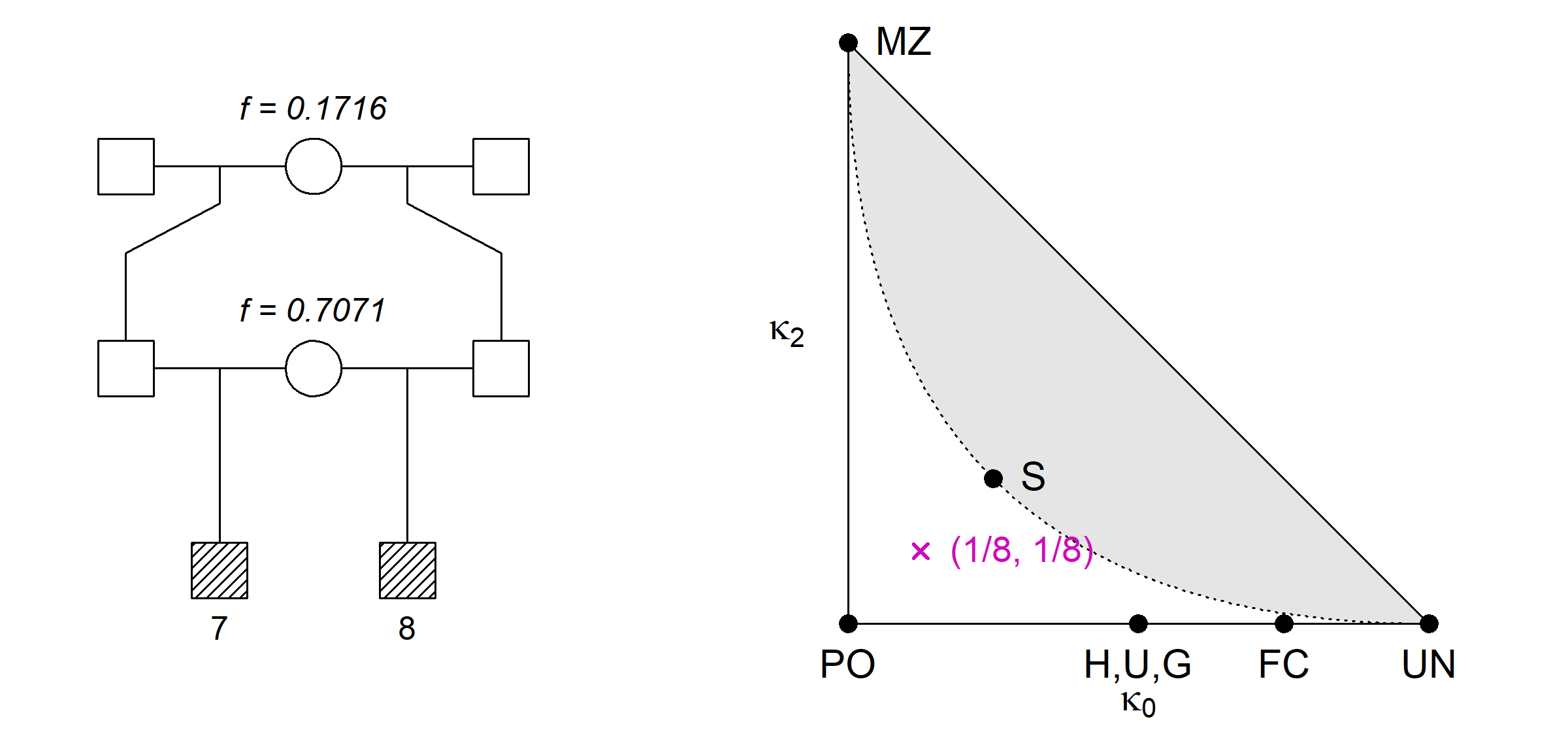 As shown by Thompson (1976), all relationships of noninbred individuals satisfy a certain quadratic inequality in the kappa’s, resulting in an unattainable region of the triangle (shown in grey above).
