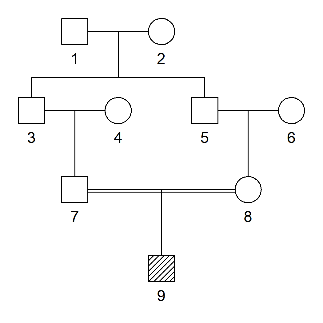 #> [1] 0.0625By definition, the inbreeding coefficient equals the kinship coefficient of the parents, individuals 7 and 8: