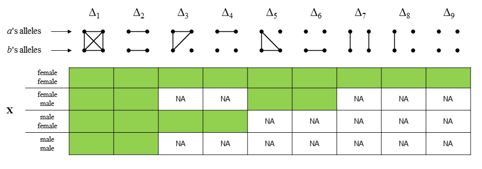 Males, being hemizygous, have only 1 allele of a locus on X. Hence when males are involved the total number of alleles is less than 4, rendering the autosomal states pictured above meaningless. However, to avoid drawing (and learning the ordering of) new states for each sex combination, we can re-use the autosomal state pictograms by invoking the following simple rule: Replace the single allele of any male, with a pair of autozygous alleles. This gives a one-to-one map from the X states to the autosomal states.