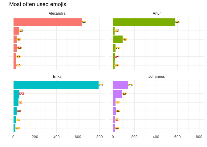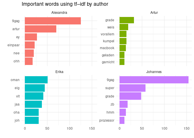 Overall, WhatsApp data is just a fun source to play around with text mining methods. But if you have more serious data, a proper text analysis is also possible, just like with other social media data.