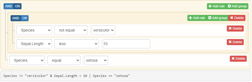 #> Species != "versicolor" & Sepal.Length < 10 | Species == "setosa"In order to initialize queryBuilderInput with the above