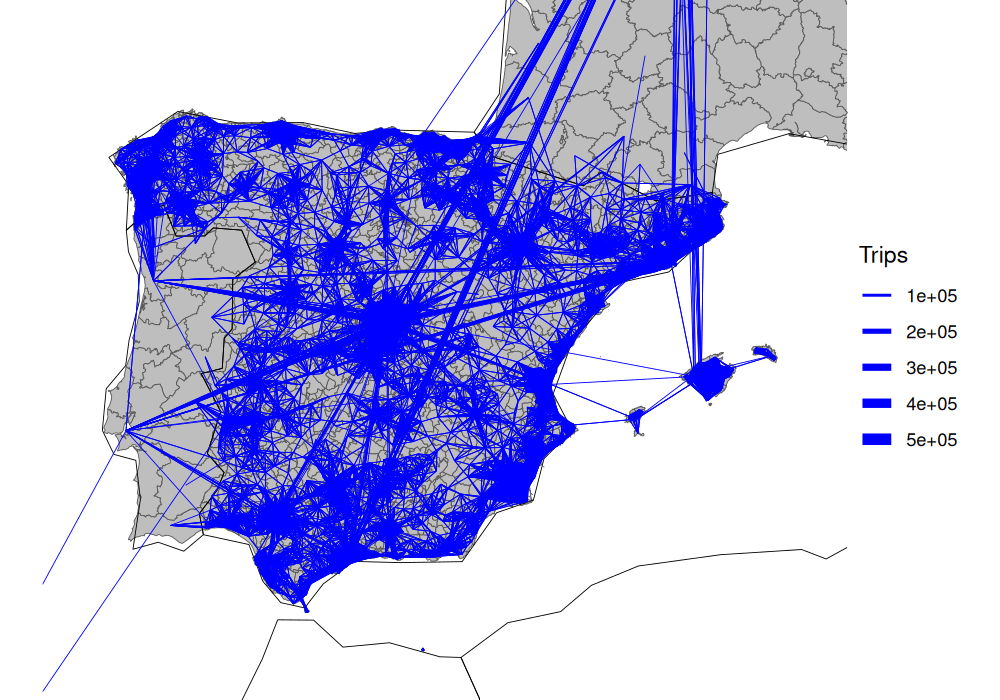 We’ll use the same input data to pick-out the most important flows in Spain, with a focus on longer trips for visualisation:
