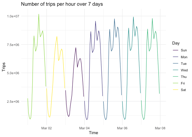 labs(title = "Number of trips per hour over 7 days")