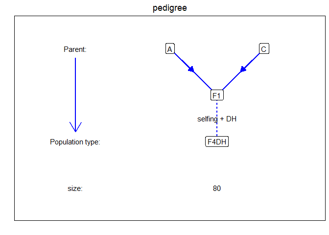 Here we give a simple example, using a single biparental population. The example contains simulated data for one F4DH population. The population type F4DH is a cross between two parents, A and C, followed by 3 generations of selfings, followed by a DH generation, see statgenIBD for details.