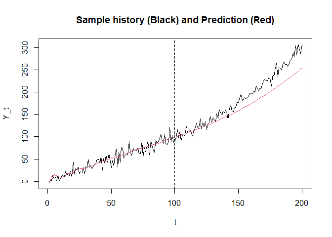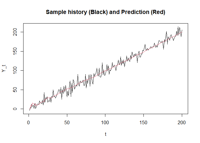 xlab = "t", ylab = "Y_t", main = "Sample history (Black) and Prediction (Red)")